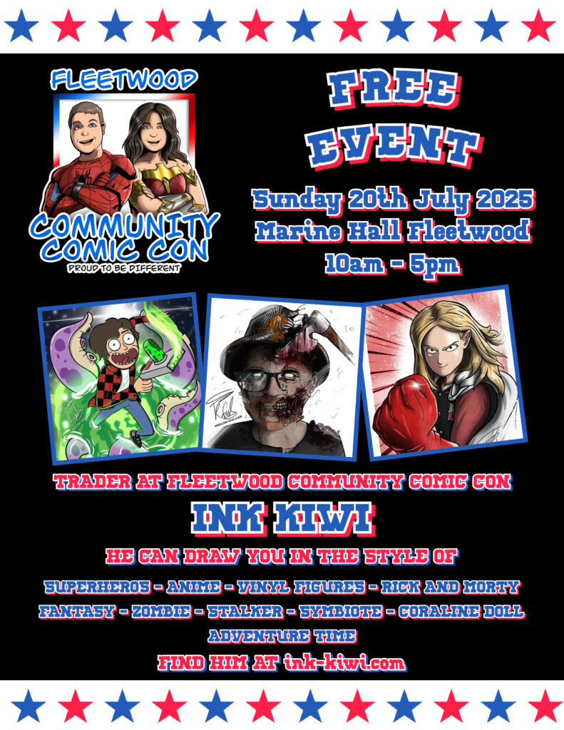 Kieran the artist who is the creative mind behind Fleetwood Community Comic Con’s logo, will be offering custom commission-based portraits inspired by popular media, including zombies and anime styles. As well as Funko Pop figures and so much more.