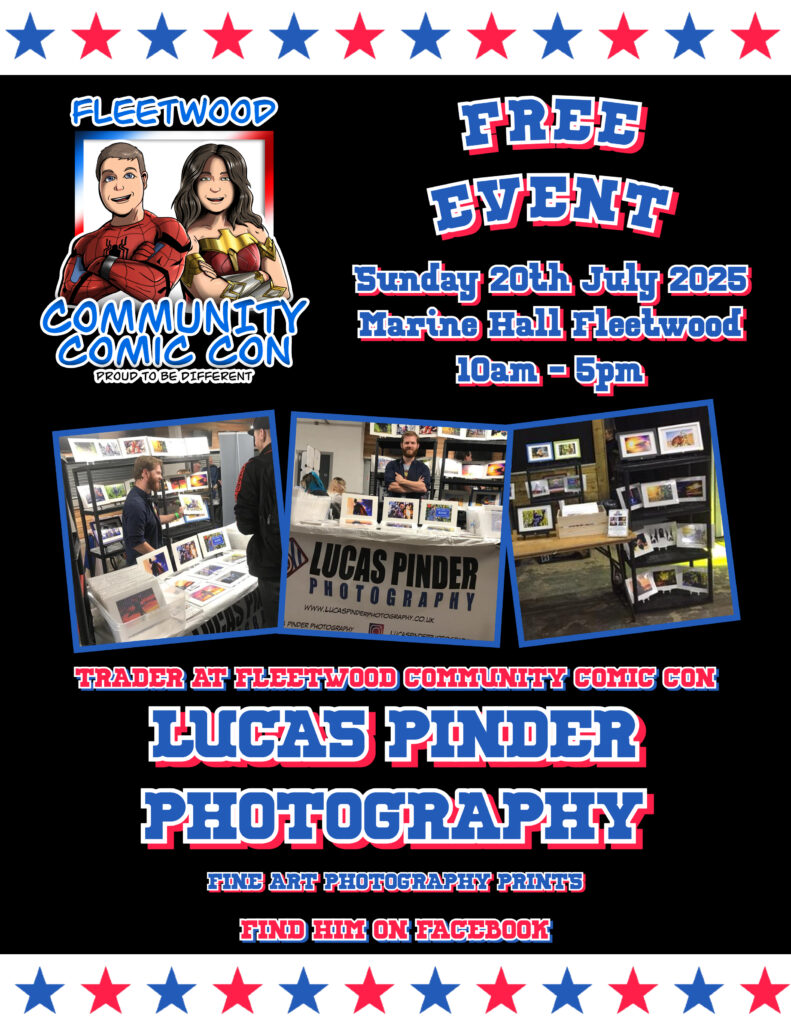 Lucas will be showcasing a stunning collection of comic-con themed photography prints, featuring iconic characters, vibrant cosplay moments, and creative shots from the world of pop culture. Whether you’re a fan of superheroes, movies, or gaming, there’s a print for every fan.