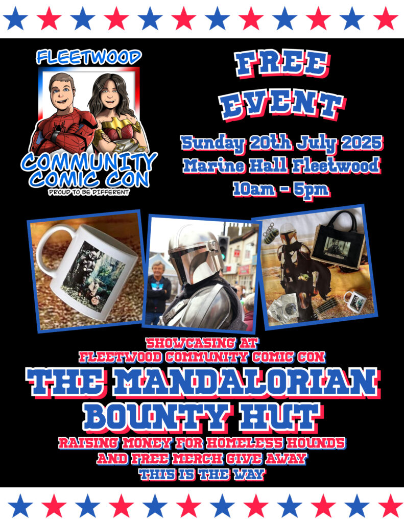 The brilliant Blackpool Mandalorian will be giving away free merch throughout the day whilst raising funds for Homeless Hounds, helping dogs in need find their forever homes 🐕