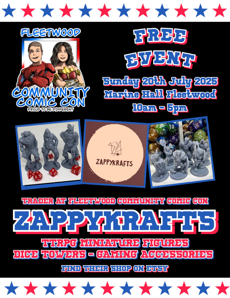 Join the adventure and browse through ZappyKrafts’ high-quality creations at Fleetwood Community Comic Con. Don’t miss out—stop by their table and level up your tabletop game 🎭